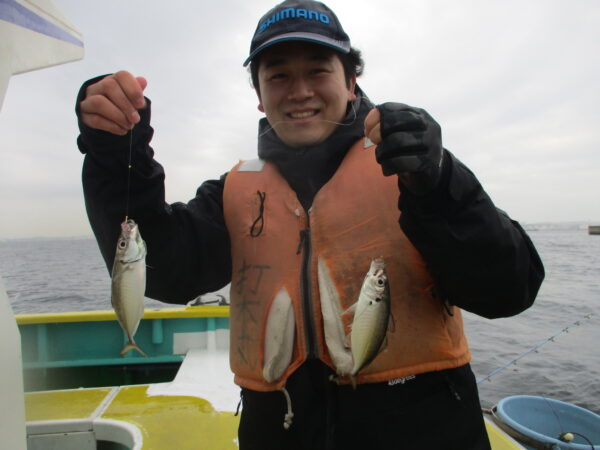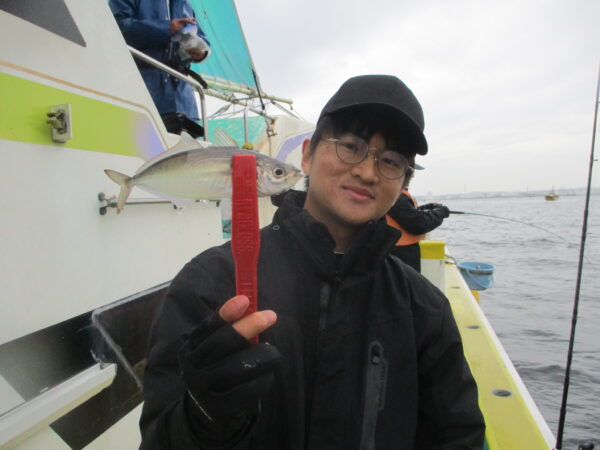 ※横浜沖を釣りました。朝のうちは小雨が残って、降ったり止んだりでした。朝からポツリ、ポツリと間が空く感じでした。後半も活性がイマイチで、粘り釣りでポツリ、ポツリでしたが中アジも混じりました。