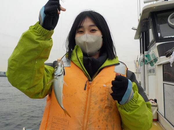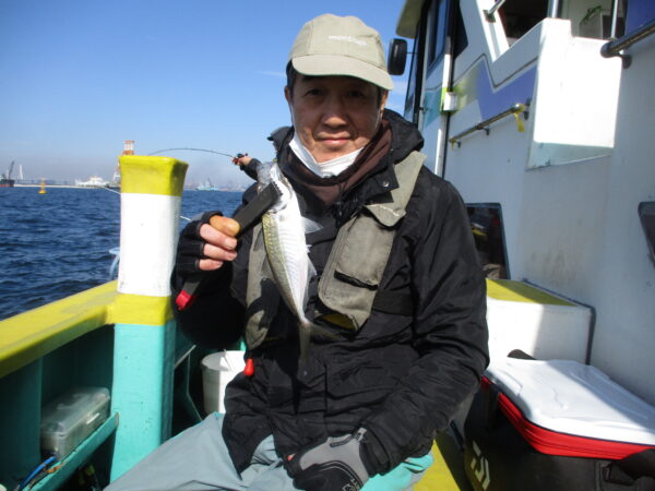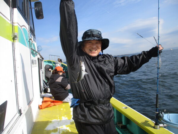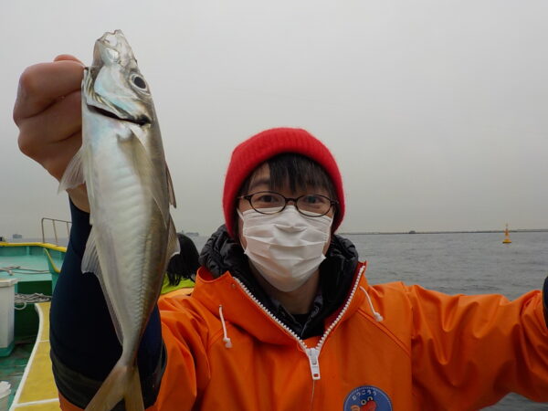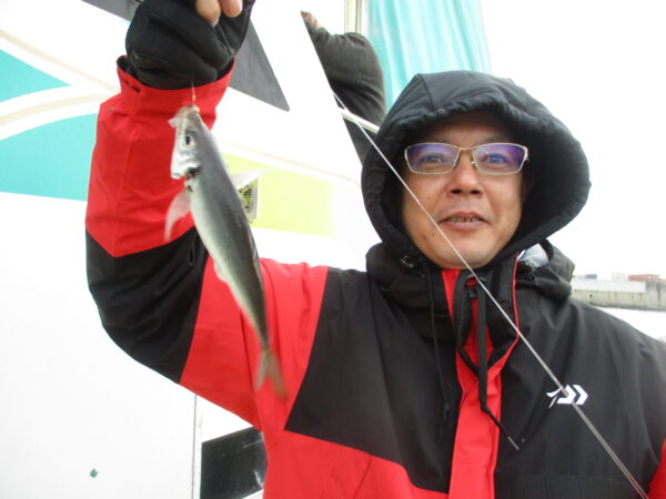 ※横浜沖を釣りました。朝の内は風も無く釣り易かったのですが、9時過ぎ頃から南風が段々と強く吹き始めてきました。はじめのうちは、ポツリ、ポツリと皆さんに釣れていましたが、風が吹いてくると釣りにくくなって、アジもたまに釣れて来る感じでした。