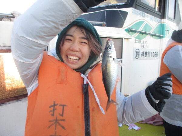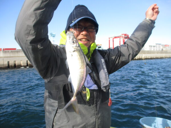 ※横浜沖を釣りました。穏やかな北風で釣りが出来ました。アジの喰いは朝からポツリ、ポツリと釣れて来る感じで、皆さんに釣れて来てくれていました。針掛かりが渋く、居食いして針に掛かって来てくれ無いのが多く見られていました。お一人だけ坊主がでてしまいました。他の人達は、5尾ぐらいから10尾ぐらいは釣れてきていました。